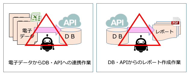 RPAツールは「システム」と「人」の中間に位置します。ソフトウェアのロボットにより「ルールと手順がしっかり決められた定型処理のパソコン操作を、人の代わりに自動化する」ことを得意としていて、特に大量のデータを短期間に処理する業務や曜日、季節などで作業量が大きく変動するような業務、さらに海外との時差で営業時間外に行う必要があるなどの時間的な制約がある業務に向いていると言われています。